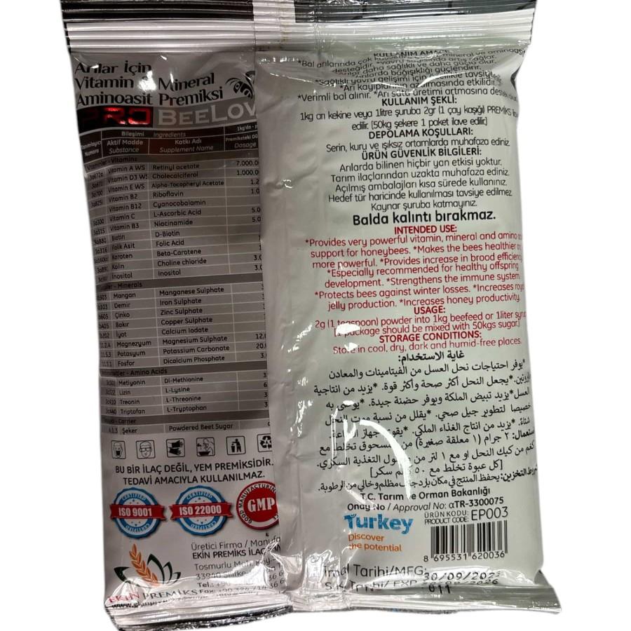 İdeal Karışım Oranı: Her 1 kg arı keki veya 1 litrelik besleme şurubu içerisine 2 gram (yaklaşık 1 çay kaşığı) premiks ilave edilmelidir.